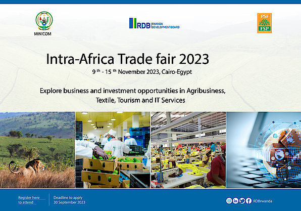 RDB in collaboration with the Ministry of Trade and Industry and the Private Sector federation is calling upon companies in the sectors of Agribusiness, textile, tourism and IT services to register for participation in the third edition of the Intra-Africa Trade fair 2023 scheduled from 9th to 15th November 2023, in Cairo-Egypt. Fifteen (15) companies will be facilitated with exhibition space, and they are expected to cater for the other expenses related to their participation.